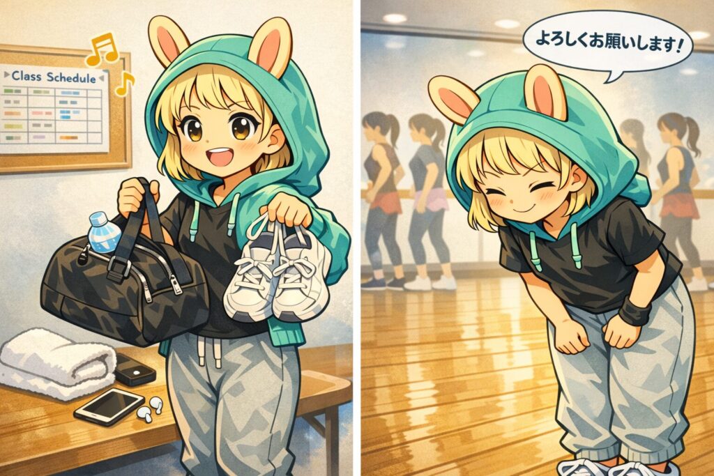 ダンス業界ではいつでも「おはようございます」と挨拶するのが定番です。最初は周りを見ながら始まりと終わりにあいさつをしてみましょう。 - 他の生徒にも配慮を
